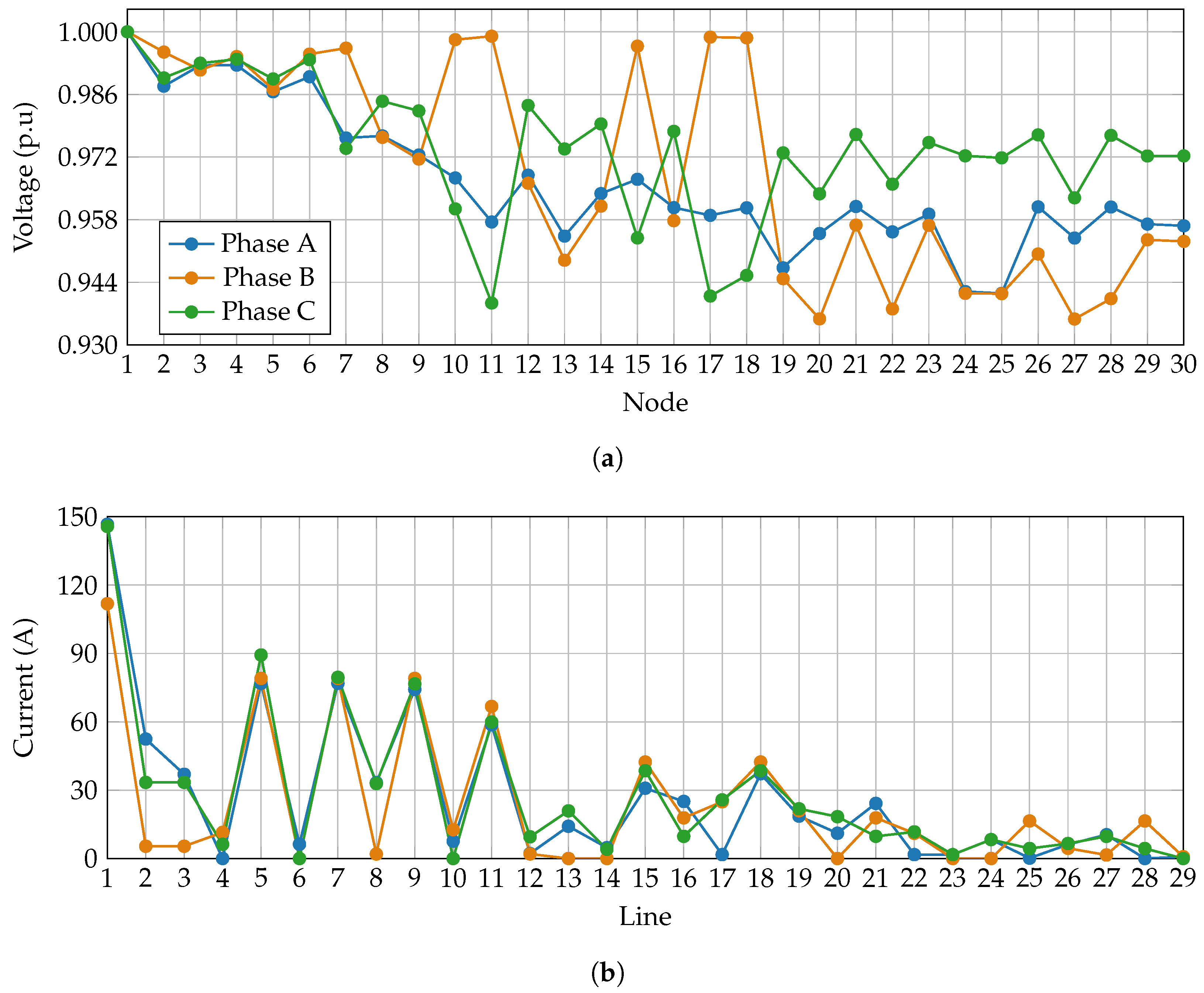 - Macedo, L.H.; Vargas, R.; Home-Ortiz, J.M.; Mantovani, J.R.S.; Romero, R.; Catalao, J.P.S. Increasing the PV Hosting Capacity in Unbalanced Three-Phase Distribution Networks Through Reconfiguration with Closed-Loop Operation. In Proceedings of the 2021 IEEE International Conference on Environment and Electrical Engineering and 2021 IEEE Industrial and Commercial Power Systems Europe (EEEIC/I&CPS Europe), Bari, Italy, 7–10 September 2021; pp. 1–6. [Google Scholar] [CrossRef]