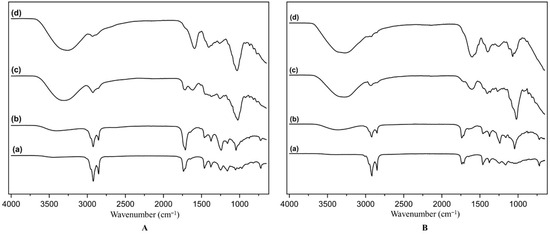 FTIR Spectra of hexane (a), ethyl acetate (b), methanol (c), and water (d) extracts of twig (A) and leaf (B).