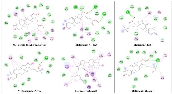 Phytochemical compounds from twig and leaf extracts exhibit varying binding affinities to these target proteins. Compounds with the highest binding affinity for each protein include meliasenin O for ACP reductase, meliasenin N for FtsZ, melianone for TolC, meliasenin M for AcrA and AcrD, and isofucosterol for AcrB (Table 9). These best-docked phytocompounds resulted in numerous interactions with the targeted protein, namely hydrogen bonds, van der Waals forces, alkyl interactions, and pi-sigma interactions (Figure 3). Notably, meliasenin M/N/O compounds, abundant in the TE extract, have not been previously reported for their antibacterial activity. Studies indicate that an isomer of isofucosterol, fucosterol, exhibits significant antibacterial activity against E. coli [36]. Additionally, melianone has been reported to inhibit Salmonella typhi by binding to the periplasmic opening of the FocA channel protein, increasing formate concentration, reducing bacterial populations, and causing severe membrane disruption [37]. These findings suggest that the antibacterial activity of the extracts may involve multiple mechanisms and synergistic interactions among various phytochemical components.