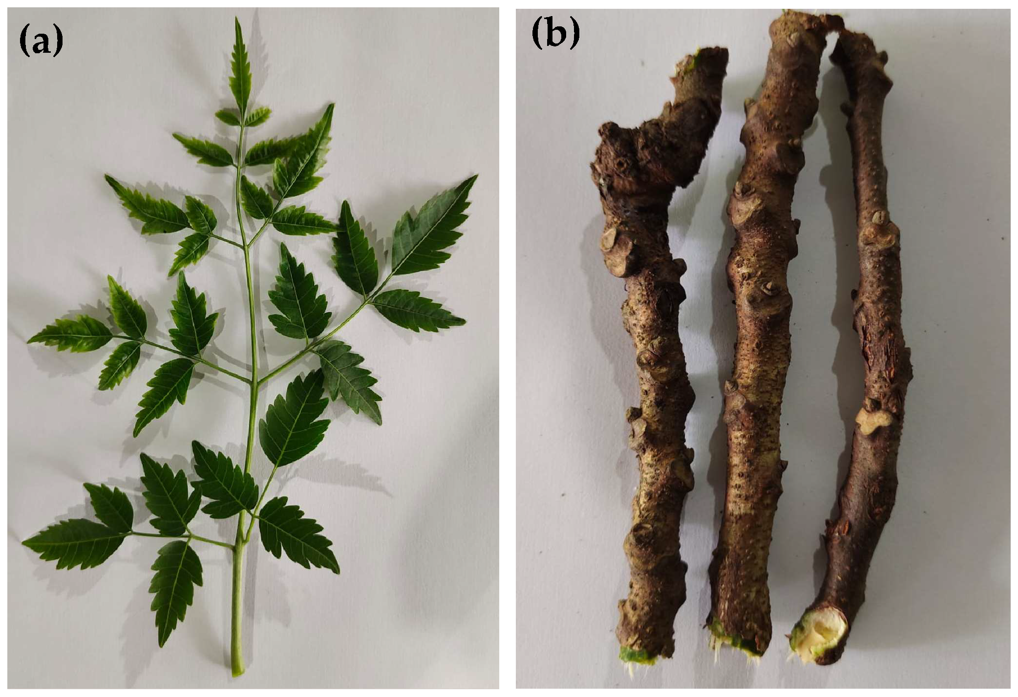 The leaves and twigs were collected from a 10-year-old Melia azedarach tree in the Cikabayan Forest, IPB University, located at 6°32′25.47″ N and 106°42′53.22″ E, with an altitude of 142.60 m, Bogor, Indonesia. The voucher specimen was deposited under voucher number BMK0085082016. The leaves and twigs (Figure 1) were cleaned and separated from each other. For the leaf samples, only the leaf blades were used (without the petioles). Meanwhile, the twig samples consisted of whole twigs without peeling the bark. Both samples were chopped and dried in an oven at 45 °C for 24 h. The dried samples were then ground into powder and sieved using a 40–60 mesh sieve, yielding leaf and twig powders with particle sizes ranging from 0.25 to 0.425 mm.