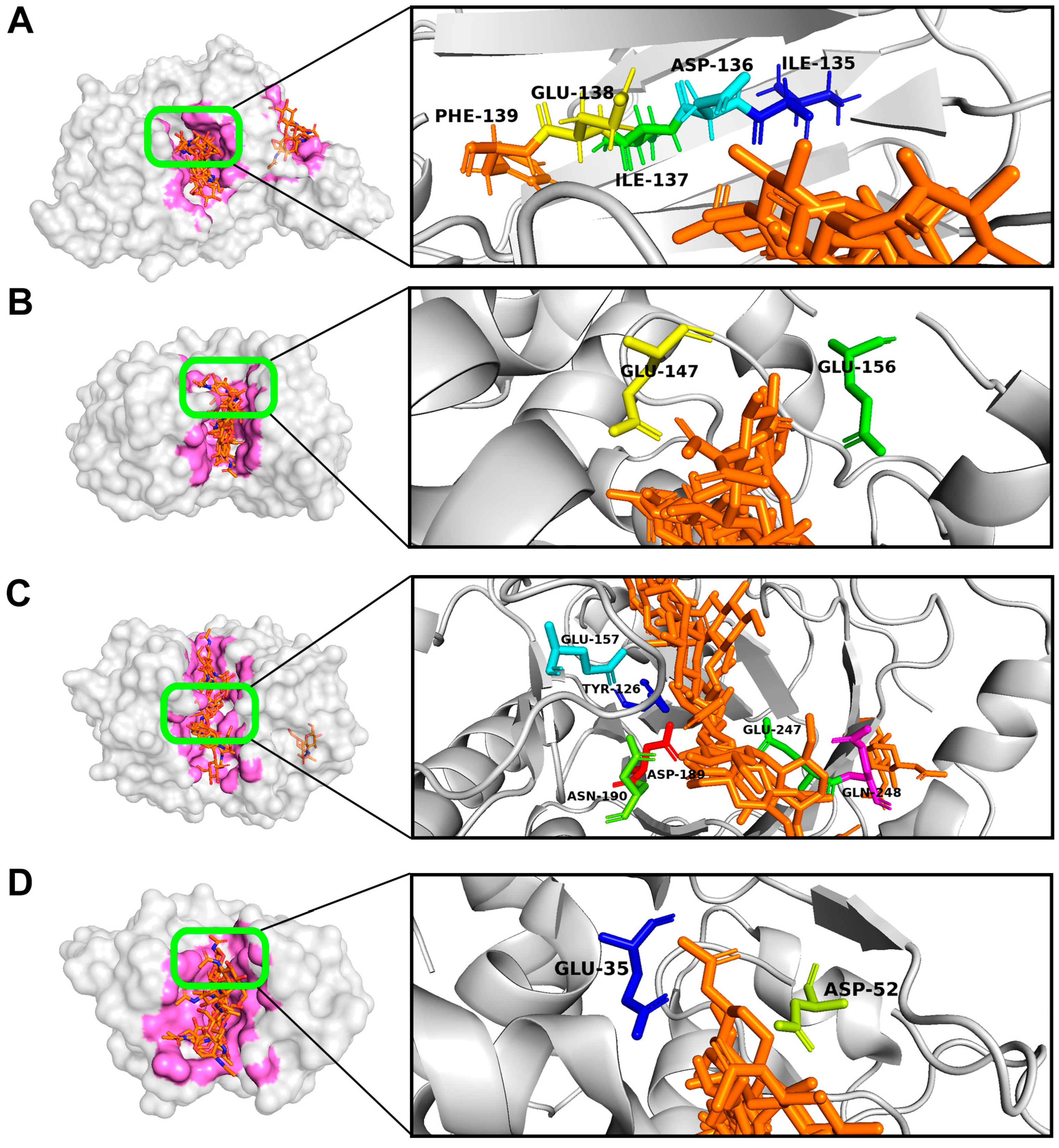 3.2.2. Interaction of PAAs with the Molecules of Enzymes Degrading Fungal Cell Wall Components