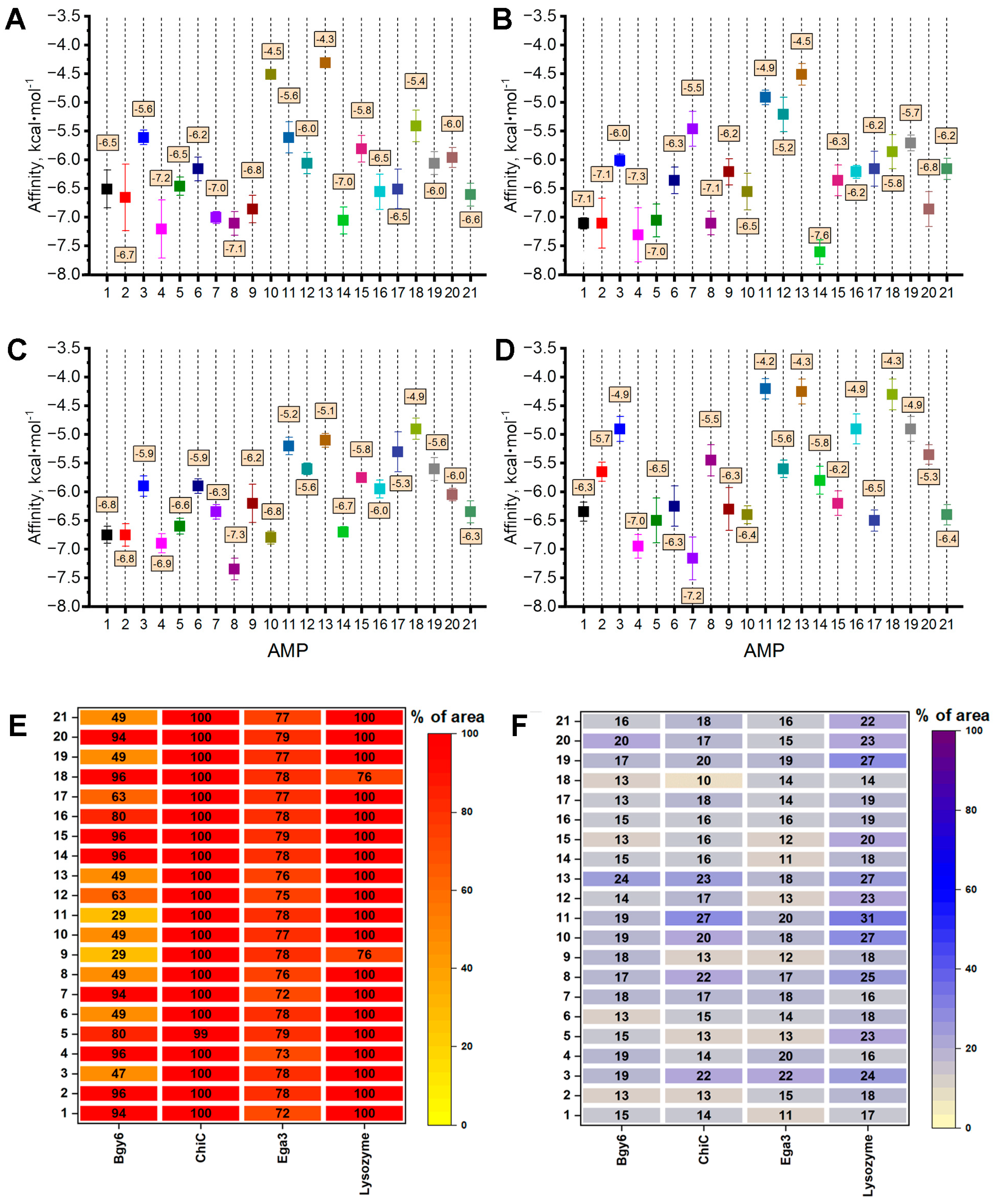 3.2.1. Interaction of AMPs with the Enzymes Degrading Fungal Cell Wall Components