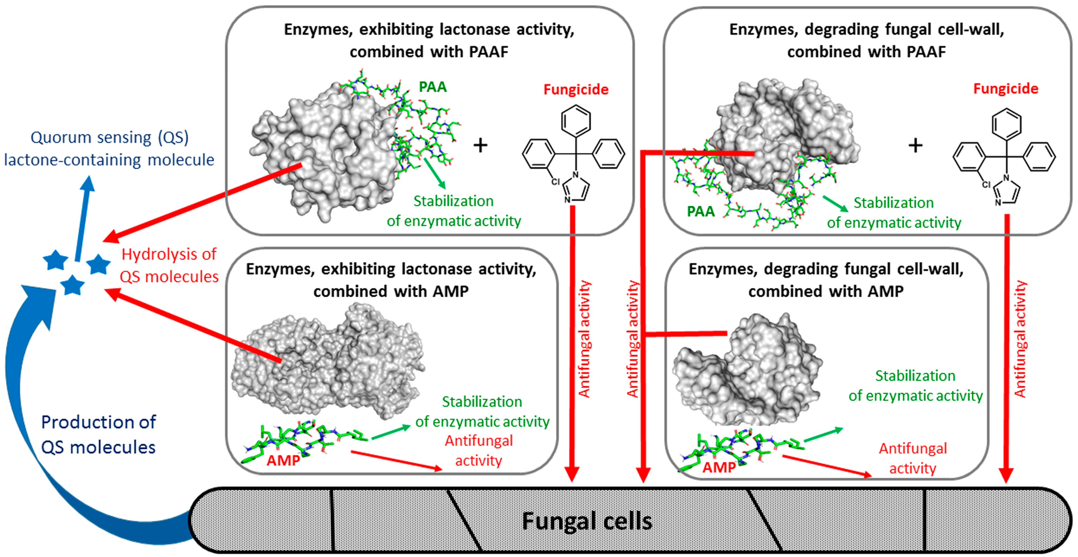 - Efremenko, E.; Aslanli, A.; Domnin, M.; Stepanov, N.; Senko, O. Enzymes with Lactonase Activity against Fungal Quorum Molecules as Effective Antifungals. Biomolecules 2024, 14, 383. [Google Scholar] [CrossRef]