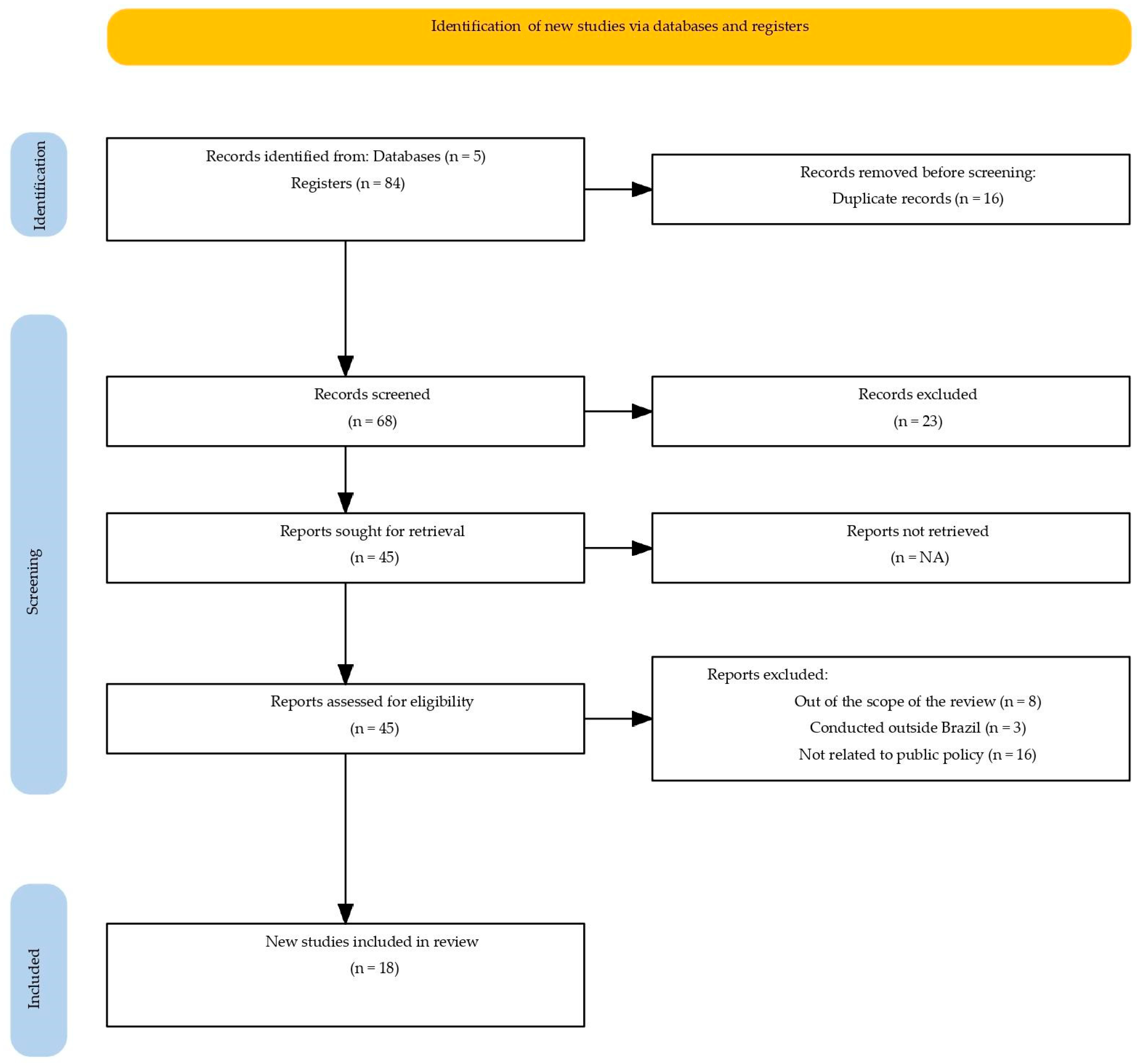 15], with the objective of mapping Brazilian public policies on iron supplementation and/or food fortification for the prevention and control of iron deficiency anemia between 1977 and 2025. The protocol for this review was prospectively registered on the Open Science Framework (OSF) [