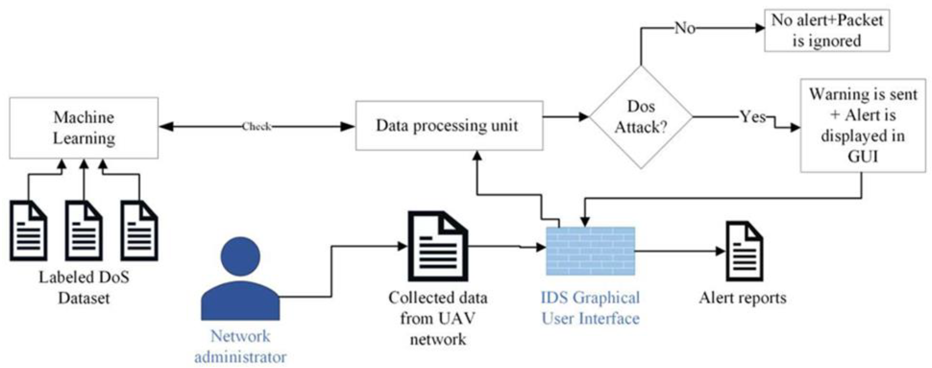 The network administrator logs into the system through the IDS GUI web application and uploads the network traffic collected from the UAV network they manage. The data processing unit utilizes a reliable labeled dataset, CIC-IDS 2018, serving as the knowledge base for the IDS system. The IDS applies to the Random Forest (RF) machine learning algorithm for classification, using selected features relevant to detecting DoS attacks on UAV networks. If a DoS attack is detected, a warning is sent via email, including the source IP address of the attacker and the time of the alert. These alert details are also visible to the administrator in the GUI, and a report of the alerts can be generated upon request. Additionally, the source IP address associated with the DoS attack packets will be added to a blacklist, allowing network administrators to implement mitigation measures. If no DoS attack is detected, no alert is generated, and the packet is ignored.