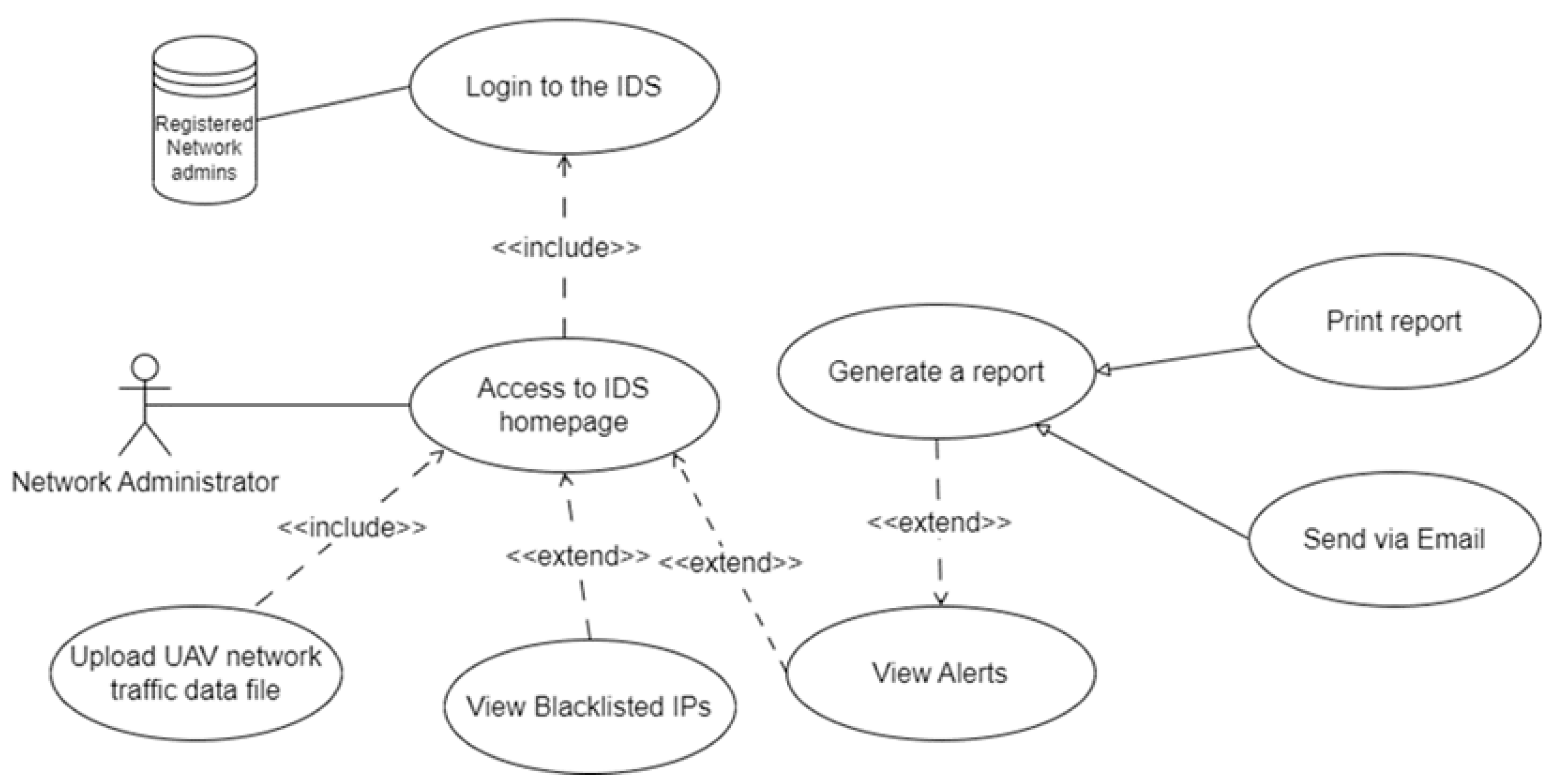 Figure 4 shows a use case diagram that illustrates how the network administrators interact with the IDS GUI interfaces.