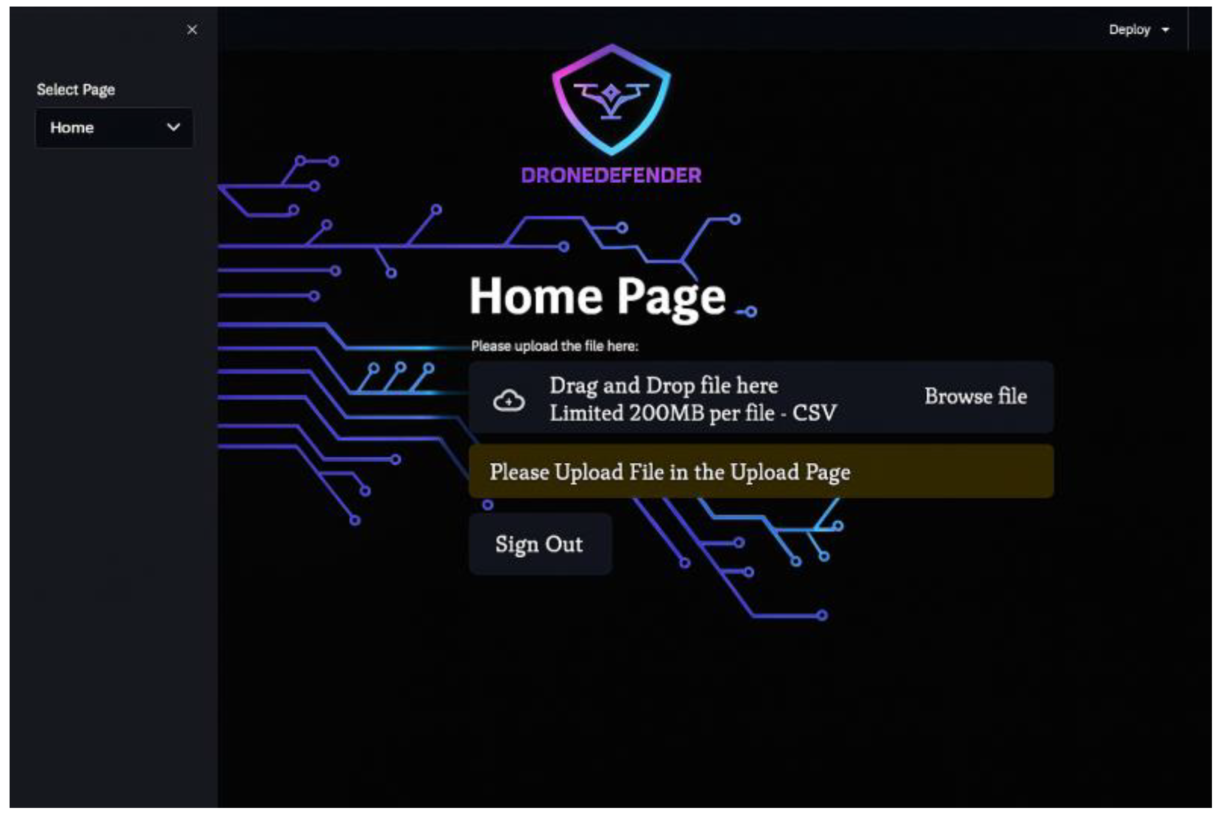 Performance Testing: DroneDefender must operate as expected, without interruptions that could disrupt functionality. The system should upload a dataset from the user and process it to produce accurate results. To test DroneDefender’s performance, the dataset will be uploaded for processing by the machine learning model to detect suspicious behavior in network traffic, leading to the generation of alerts and blacklisting of suspicious IP addresses.