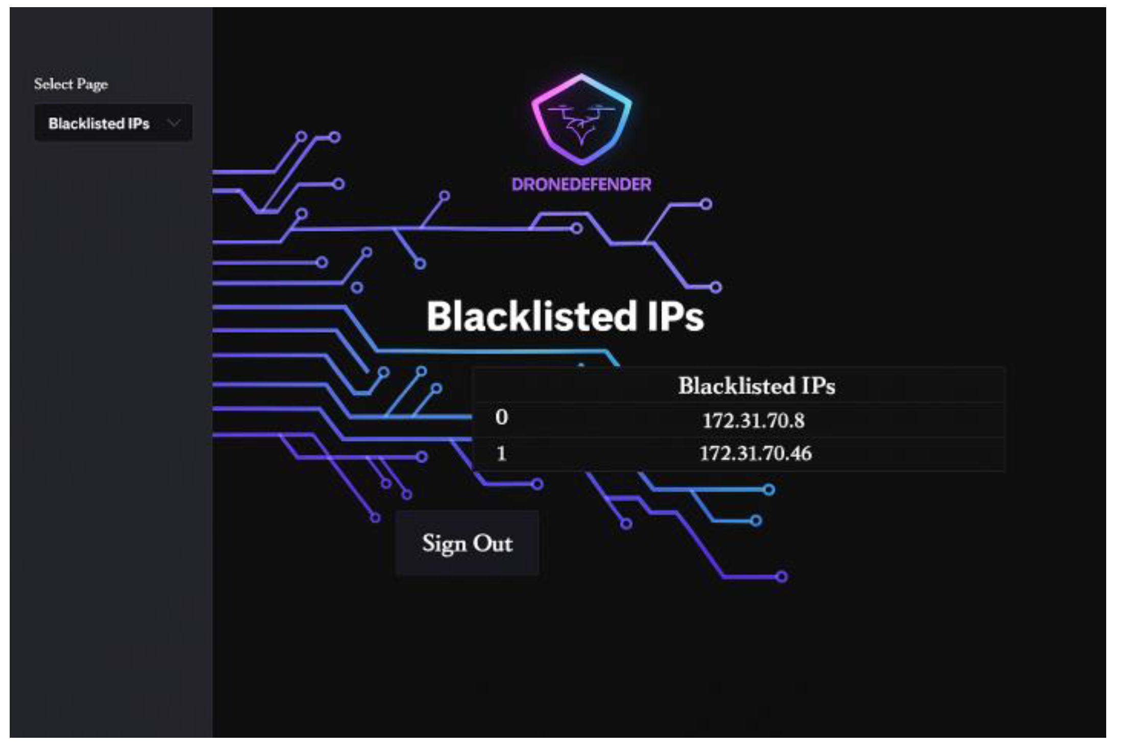 The primary purpose of this web application is to enable the network administrator to utilize the trained machine learning model to analyze, detect, and identify DoS attack patterns within the uploaded UAV network traffic data file, as well as to view the results. The application consists of four straightforward interfaces. The login interface authenticates the provided username and password credentials against the pre-registered admin information stored in the database. The home page displays the uploaded dataset after the feature selection process, allowing administrators to manually analyze the network traffic based on selected features relevant to detecting DoS attack patterns. Additionally, the home page shows the percentages of correct predictions for each class produced by the machine learning model after processing the uploaded data. The Alerts and Blacklisted IPs interface presents tables of generated alerts and blacklisted IPs (source IPs of attackers), respectively.
