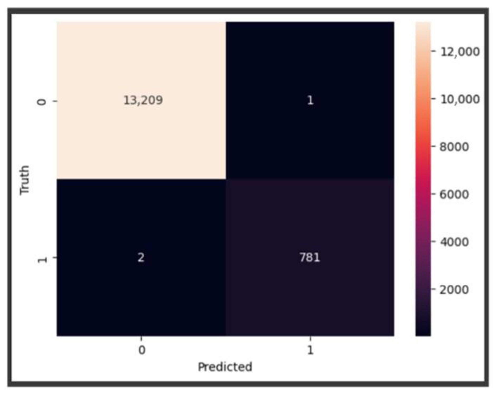 The basic RF model using default parameters and the original dataset achieved an impressive testing accuracy of 99.99%, with perfect scores of 100% for recall, precision, and F1-score.