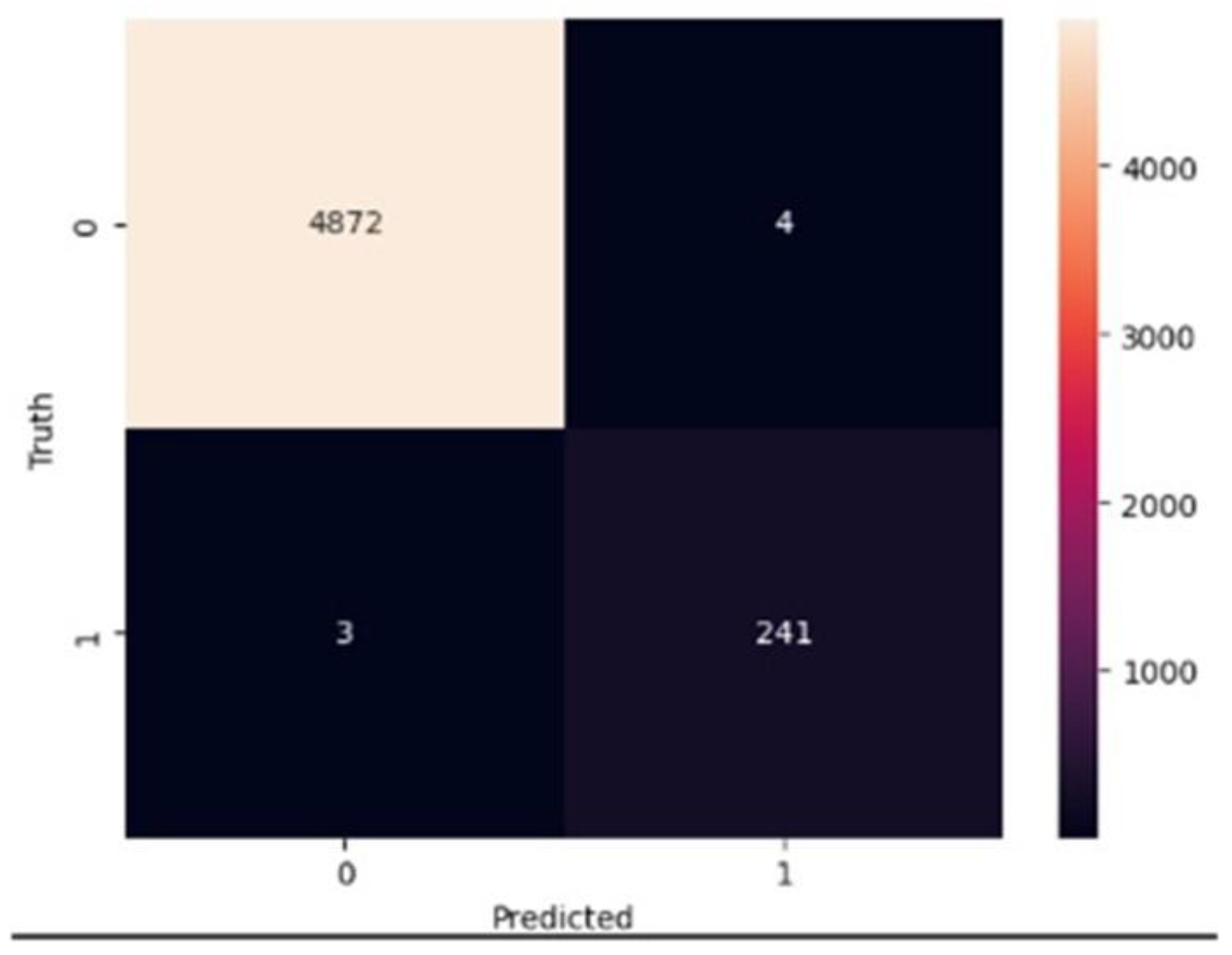 When the same basic RF model was trained on the SMOTEENN preprocessed data, the testing accuracy slightly decreased to 99.92%, while recall, precision, and F1-score remained at the perfect 100% level.
