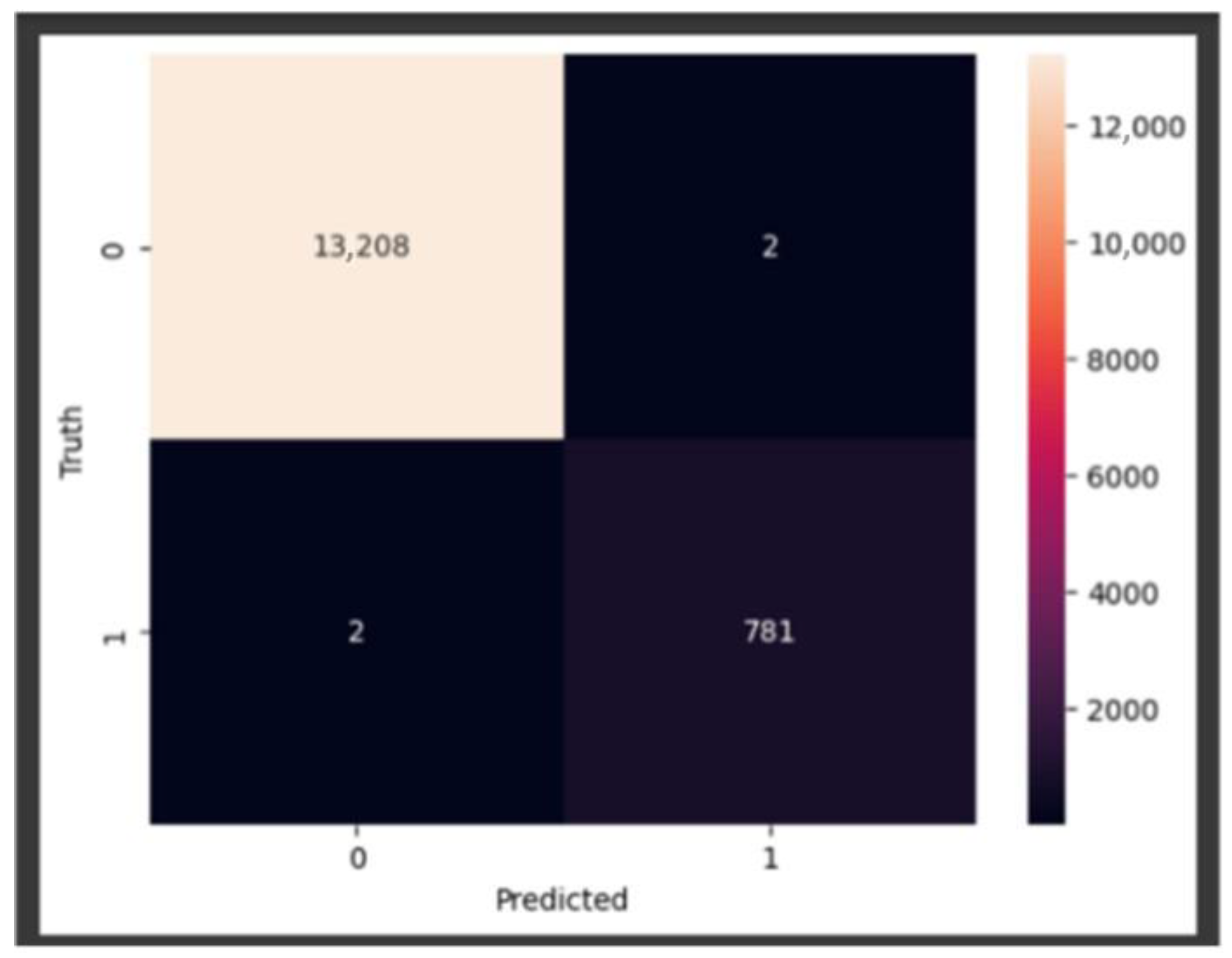 The CIC-IDS2018 dataset was first cleaned, duplicates were eliminated, labels were combined into binary classes, and only the 13 GA-selected DoS-relevant characteristics were kept in order to make the assessment process more understandable. In order to maintain the original class distribution, the dataset was subsequently split into 70% training and 30% testing using a stratified split (random state = 42). Crucially, SMOTEENN was limited to the training phase, guaranteeing that the test set did not contain any artificial samples or resampled data. Grid search with cross-validation was used to optimize the model solely on the training data in order to reduce overfitting. The completed model was then assessed once on the unaltered test split. Together, these actions end due to optimistic bias and data leakage. Although the resultant near-perfect performance might seem abnormally high, it is compatible with (i) the categorization into setting, (ii) the exceptional discriminative strength of the chosen features, and (iii) Random Forest’s aptitude for this sort of dataset—a pattern that has also been seen in previous publications.