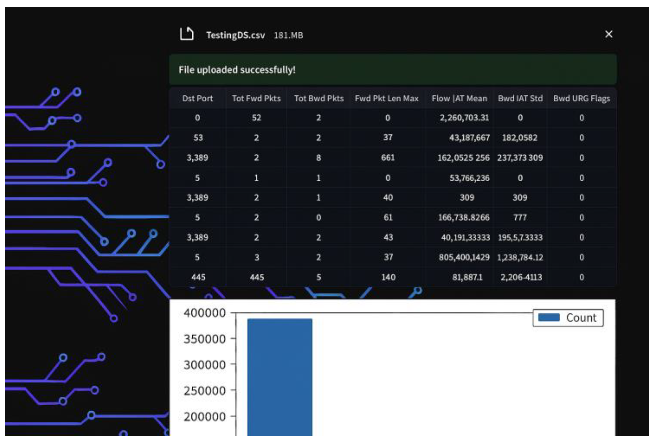 | Expected Result | A message indicating successful file upload will be displayed, and a bar chart graph of the packet counts for each IP address found in the input file will be shown, as in Figure 18.