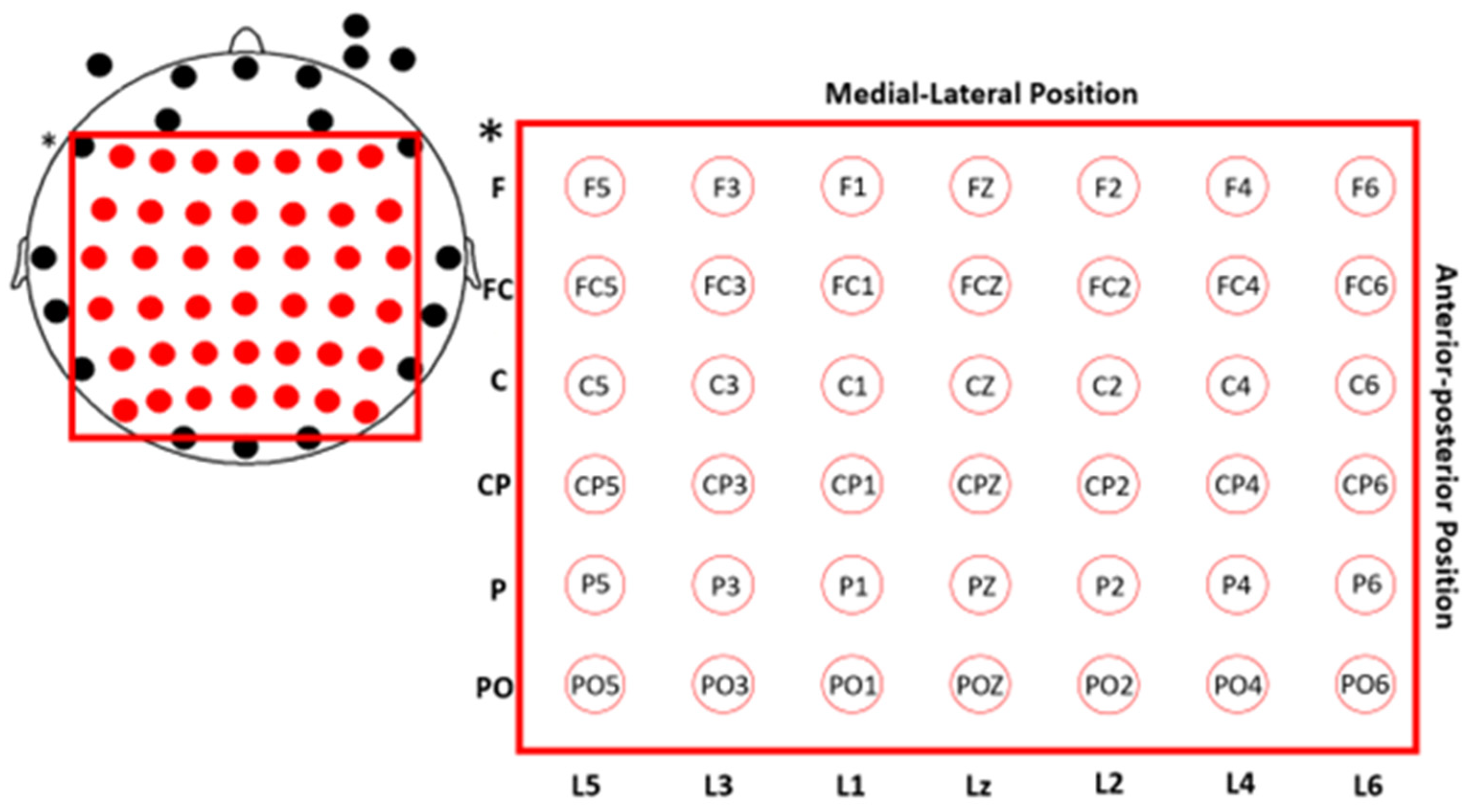 Figure 1. Electrode scalp locations. Note: EEG recording was performed with all electrodes shown in the figure. However, only the 6 × 7 electrode array marked in red was used in the subsequent analysis. Abbreviations F (frontal), FC (frontocentral), C (central), CP (central–parietal), P (parietal), PO (parieto-occipital) L (Lines 1–6; “Lz” stands for the central line of electrodes). * shows the 6 × 7 matrix of electrodes analyzed.