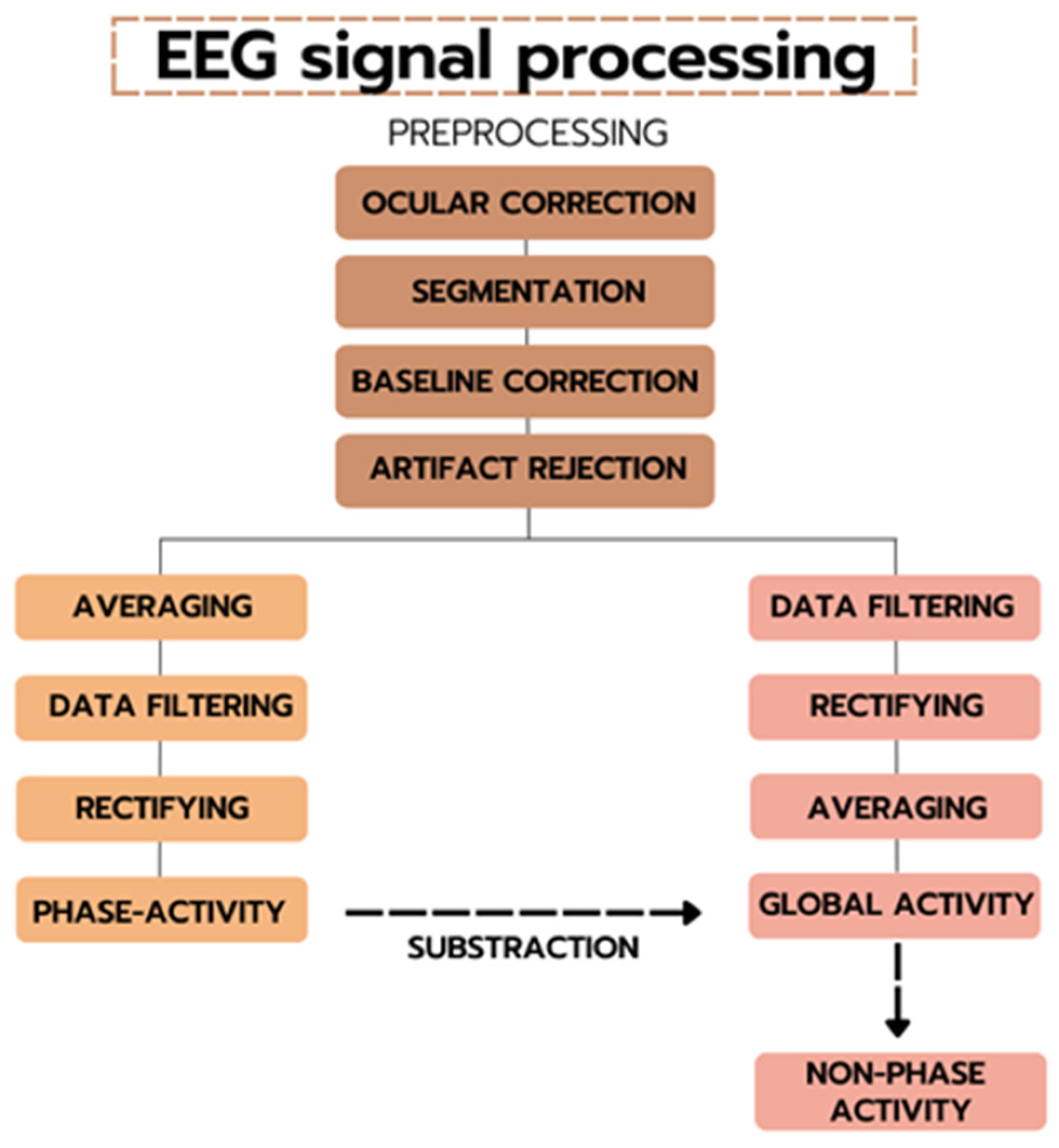 Figure 2. Flow diagram of phase and non-phase calculations. Note: Figure 2 shows the EEG signal analysis protocol. The left column shows the process of obtaining the phase activity, and the right column shows the process of obtaining the non-phase activity using TSE. The last step indicated by an arrow refers to the subtraction of the phase activity from the overall activity to calculate the non-phase activity.