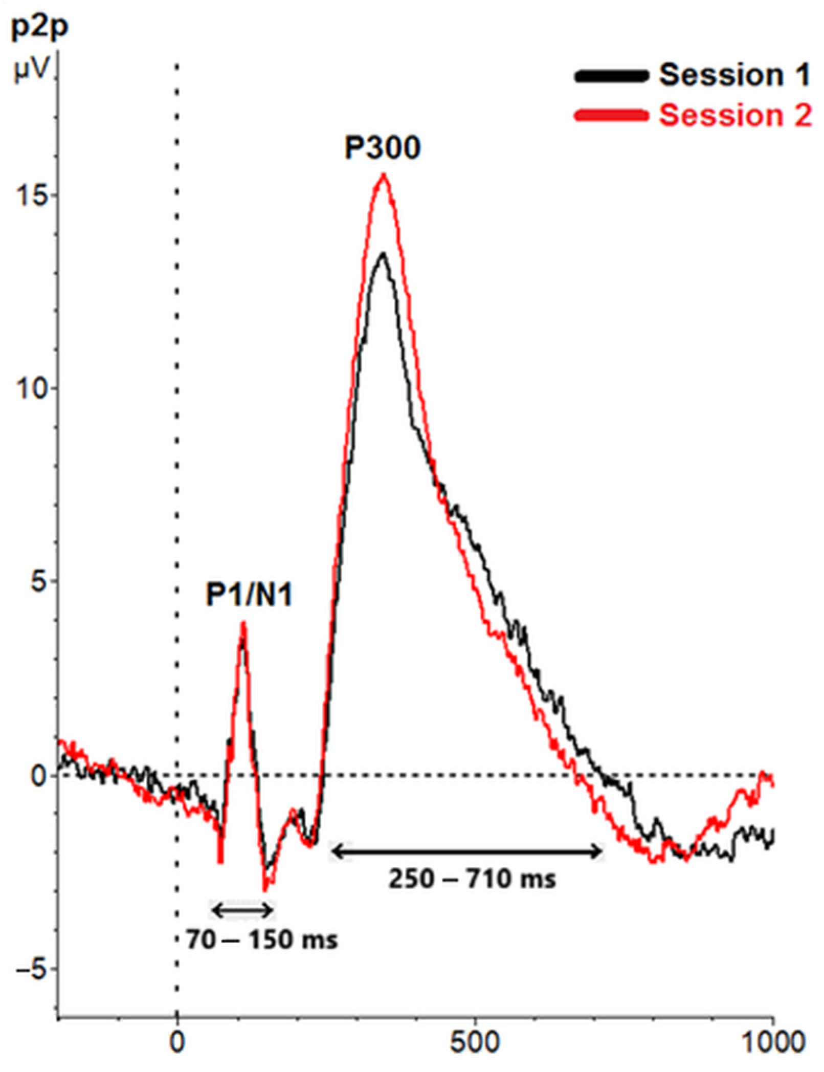 Representation of the event-related potentials (ERPs), which correspond to the EEG signal analyzed for the study of the role of gamma phase. The data for session 1 is shown in black, and the data for session 2 is shown in red. Both are measured at the P2P electrode.