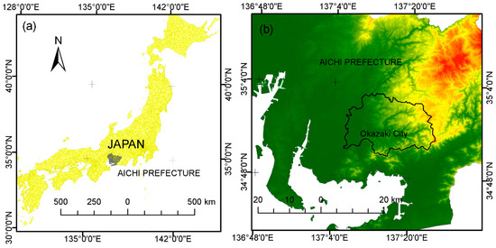 The study area is located in the middle part of Aichi Prefecture Japan and has an area of 387.20 km2 [36] from Latitude 34°53′30″ N to 35°2′30″ N and Longitude 137°7′0″ E to 137°25′0″ E. Okazaki City is the third biggest city in Aichi Prefecture [36] with a population of 382,846 people [37]. It has a humid subtropical climate and an elevation ranging from 0 m to 789 m above sea level [36]. The central city consists of alluvial plains. The eastern part of the city is a mountainous area which has an altitude of 789 m (i.e., Mt. Hongu) and the rest is lowland area which has an altitude ranging between 0 and 300 m [37]. We selected the lowland area as the study area as shown in Figure 1. The study area is passed by big rivers, namely the Yahagi River which flows from North to South. Thus, the land use within this area is dominated by agriculture, particularly paddy fields. Precipitation occurs throughout the year with the heaviest in the summer season (i.e., June to September) and during typhoon phenomena. The temperature range is from −1 °C to 36 °C with an average annual temperature of 17.0 °C, and the annual rainfall is about 1200 mm/year.