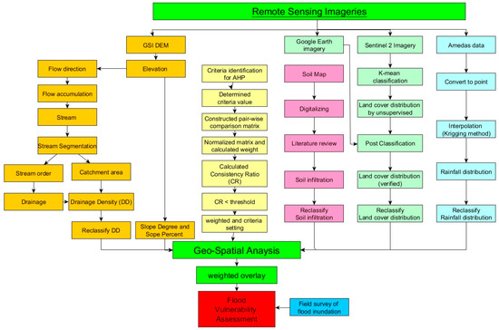 Vulnerability maps can be utilized in all steps of disaster management: prevention, mitigation, preparedness, operations, relief, recovery and lessons learned [41]. In recent years, urban areas have faced increased risk of disasters and the potential of economic and human losses from natural hazards. To build sustainable communities in the urban area, integration between urban planning and hazard mitigation effort is necessary [20,32]. Thus, the vulnerability map can be used as one of the strategies for scenario modeling for urban planning. Integrating the remote sensing data, GIS and AHP are quite effective tools to generate flood vulnerability data for urban areas. The overall method description for flood vulnerability is explained in Figure 2. There are five physical parameters for flood vulnerability utilized in this study, namely, rainfall, drainage density, slope, soil and land cover. We generated the slope map and drainage density from Digital Elevation Model (DEM) data from the Geospatial Information Authority of Japan (GSI). Soil map distribution was generated from MLIT. The rainfall spatial distribution was generated from AMEDAS (Automated Meteorological Data Acquisition System) data from the Japan Meteorology Agency (JMA). The land cover was generated from Sentinel-2 imagery which was verified by Google Earth image. Then, by integrating all of those components, the flood-vulnerable area was assessed by AHP. Finally, the flood-vulnerable area was verified by using field survey data taken during the flood event in Okazaki City that was conducted by the local government of Okazaki City and MLIT. We utilized three software systems to process the data; ESA SNAP and ENVI 4.8 for processing land cover and ArcGIS 10.2.2 (ESRI, Redlands, CA, USA) for processing hydrological parameter and vulnerability index. Integrating the AHP procedure, GIS and remote sensing could preserve the up-to-date information, with low cost and good visualization.