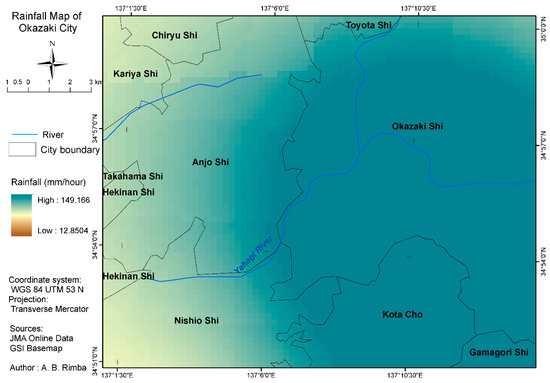 Figure 3 was generated from JMA data. It was interpolated by the Kriging Method [44] from 20 points observation in Aichi Prefecture during extreme rainfall (i.e., the rainfall intensity was 146 mm/h or 263.5 mm in two hours on 29 August 2008). Flooding could occur when the amount of rainfall was 199 mm to 435 mm for five hours or 406 mm to 608 mm for one week [43].