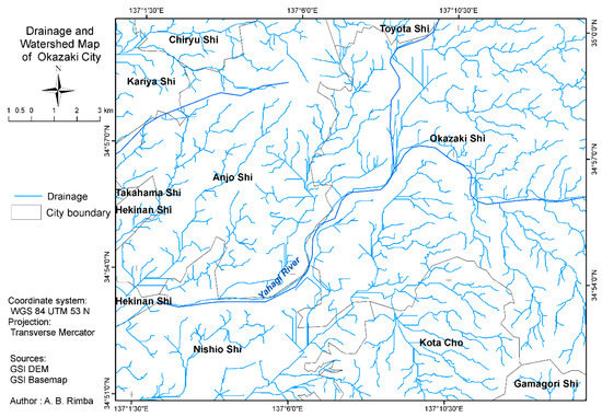 This study deals with the first element of flood-risk management, i.e., the definition of flood hazard areas in a specific region. The objective is to identify flood hazard zones, where mitigation assessment should be undertaken for urban development. Flood hazard assessment can support decision-makers and governments for urban developing. Bathrellos et al. studied hazard assessment (i.e., flood, landslide, and seismic hazard assessment) as a component to measure suitability for urban development [20] and proposed natural hazard assessment as a method for determining the suitability of urban growth and light industry development [32]. Additionally, some researchers studied flood-risk assessment as a prominent component of urban planning [33,34,35]. Thus, a spatial, multi-criteria index has been proposed to characterize such areas by integrating the technology of remote sensing and GIS to measure the physical parameters of flood vulnerability. The physical parameters of flood vulnerability were rainfall, drainage density, slope, soil and land cover. The rainfall, drainage density, slope, and land cover data were generated from satellite images; the soil was digitalized using the GIS method. All the parameters were combined by the GIS method and pairwise using AHP procedure. All data were downloaded from public open access data. The study area is located in Okazaki City, Aichi Prefecture Japan. Even though the index is tailored to the specific geography and land cover characteristics of the study area, it can be modified and applied in other areas.
