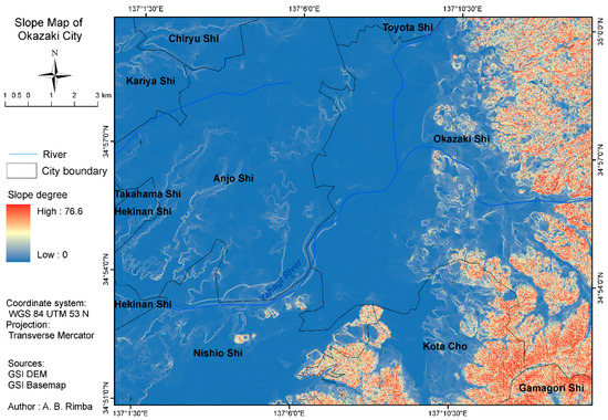 The slope is the ratio of steepness or the degree of inclination of a feature relative to the horizontal plane. Gradient, grade, incline and pitch are used interchangeable with slope [61]. The slope is typically denoted as a percentage, an angle, or a ratio. The average slope of a topographical (topo) feature can be measured from contour lines on a topo map or by DEM. The slope is achieved by dividing the rise over run. Multiply this ratio by 100 to expose slope as a percentage. The slope angle represented in degrees is obtained by taking the arctangent of the ratio between rise and run [61]. Table 2 lists the slope classification in Okazaki City.
