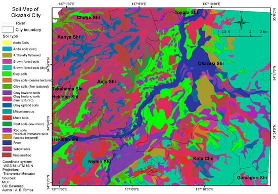 Soils in Japan are grouped into soil groups [63]. Soil groups were divided according to their morphology and parent material; soil series groups were divided according to the variation of the thickness of humus layer, freckling and texture; soil series is basic unit classification (grouped according to parent material, morphology and process) [63,64]. Table 3 lists the soil groups in Okazaki City.