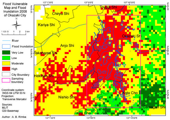 The flood-vulnerable area was distributed in the level to near level slope of 0%–2%; drainage density was more than 0.00574 m/m2; rainfall was over 80 mm/h; there was a very slow infiltration rate (1–5 mm/h) and land surface was covered by rice fields and open area. In addition, to perform the validation, flooding-based field verification was conducted by the local government of Okazaki City and MLIT was used. The survey data of flood extent was employed for verification. Figure 8 shows the flood vulnerability map, survey data of flood extent in 2008 and sample area for accuracy assessment.