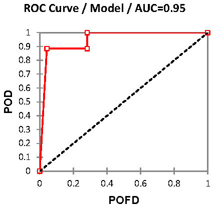 In order to validate our assessment, a quantitative method was applied. This method is based on the contingency table as shown in Table 11. The flood threshold used for flood discrimination is high-vulnerability area (red color) and non-flood discrimination is the rest (very low to moderate). In Table 11, a, b, c and d stand for “hit”, “false alarm”, “miss” and “correct negative”. The “Hit” represents correctly estimated flood area, “miss” represents when flooding is not estimated but actual flooding occurs, “false alarm” represents when flooding is estimated but flooding does not actually occur, and “correct negative” describes correctly estimated non-flooded area. Using the result shown in Table 11, we calculated the Probability of Detection (POD), Probability of False Detection (POFD), Critical Success Index (CSI), Bias and Relative Operating Characteristic (ROC) [80,81,82] as explained in Equations (7)–(10).