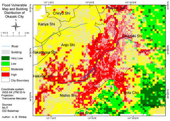 The total area of Okazaki City is approximately 95,679.2 Ha, and 10,612.07 Ha or 11.1% of the total area is highly vulnerable to flooding. From the total flood-vulnerable area in the lowland area, the land cover with the highest risk of flood was a residential area (29.6%) and agricultural area (49.5%). Those areas were close to the big river and had a slow infiltration rate, in addition to having a level to near level slope. These conditions influence the economic situation. By analysis of the building distribution and the flood-risk area, it is clear that approximately 1366.66 Ha total of construction area (i.e., offices, schools, hospitals, houses, etc.) is in the flood-prone area.