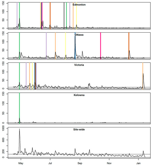 In Victoria, more people viewed the website without submitting data, while in Ottawa it was more common to actively partake in submitting data, and this was indicated by the ratio of website views to incidents mapped (Table 5). The response rates for complete age and gender reporting was consistent across cities. The median age for incidents with complete gender and age information was higher in Victoria and Kelowna than Ottawa and Edmonton. Finally, the percent of incidents reported by people over 35 years of age was similar to the web sessions for Edmonton, Kelowna, and Ottawa, while a higher percentage of people over 35 reported incidents than viewed the webpage in Victoria. The people who submitted incidents in Victoria over this time period were older than the previous data, where 35 was the approximate median age [28].