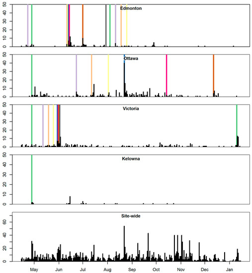The number of incidents reported on BikeMaps.org by day (black bars) and the timing of promotion events (coloured lines; no scale). See Table 1 for colour key. Note longer y-axis for site-wide incidents.