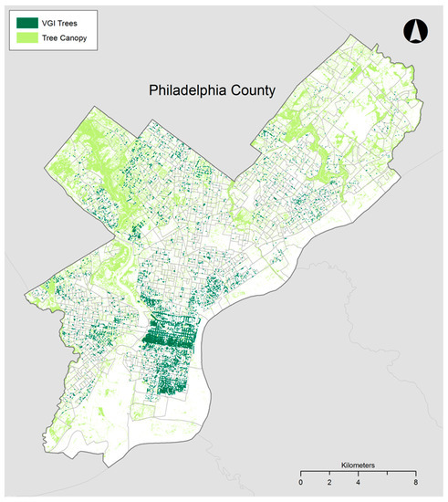 Volunteered geographic information (VGI) has expanded rapidly in recent years [1]. Defined by Elwood et al., as “geographic information acquired and made available to others through the voluntary activity of individuals or groups” [2], (p. 575), VGI is an outgrowth of recent technological trends. The early twenty-first century proliferation of Web-based collaborative and social media tools has yielded new opportunities for research. Recent Web 2.0 applications enable participants to take advantage of locative technologies such as global positioning systems to generate their own georeferenced content and data. A number of recent innovative projects have emerged to leverage participation in user-generated content to develop datasets that are reliable and accurate enough to support knowledge development and potentially serve as a tool to influence public policy decision-making processes [3]. As an example of this movement, Web-based VGI applications that provide a collaborative platform for crowdsourced urban tree inventories have been launched in a number of American cities through partnership efforts between government entities, nonprofits, and businesses. These Web 2.0 technologies that allow user-generated content, use by non-experts, and interoperability present significant opportunities for citizens and policy practitioners to engage in collaborative data gathering activities, and the availability of data has spurred innovative new research [2]. This paper examines the spatial distribution of tree mapping efforts and the richness of data contributed to VGI urban tree mapping applications in two study areas, Philadelphia, Pennsylvania and San Francisco, California, USA. This research contributes to recent interest in the implications of the democratization of data-gathering operations, and the use of data-driven computational approaches to influence policy decisions [4,5]. We specifically address how interpretations of urban forestry analysis and ecosystem services calculations may help to shape decision-making processes and approaches to community engagement, especially surrounding urban environmental amenities, and ultimately improve the environmental and social conditions of urban residents. Equity concerns ground the paper, as both unequal participation in and representation by urban forest VGI represent digital divide issues [2], and given the many benefits provided by urban forests, if uneven representation results in uneven management, environmental injustice can ensue.