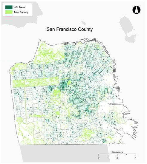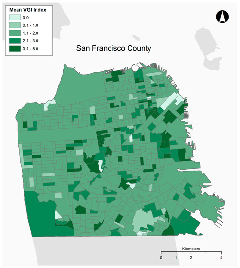 At the same time, the San Francisco Open Tree Map consisted of 88,121 trees, of which 24,376 were considered VGI trees. The VGI tree index was higher for all trees than VGI trees (2.2 compared to 1.8). Out of 578 block groups, only three contained no trees and only eight contained no VGI trees. The mean percentage of VGI trees at the block group level was 31.8.