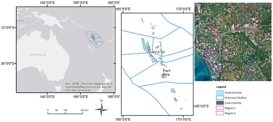 The reference map of study area, with the left map describes the location of Vanuatu in the world, and the middle map presents the territory of Vanuatu, while the right map illustrates the two selected regions in Port Vila.