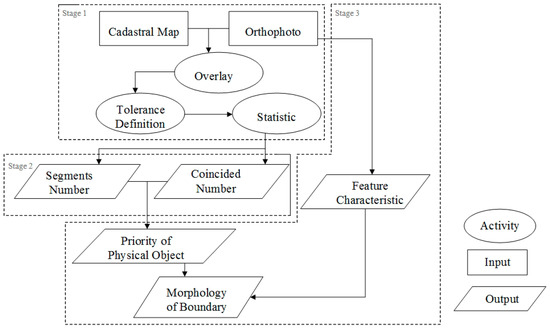 In the first stage, following basic image interpretation rules, physical objects are recognized by visual interpretation from the orthophoto. Then, by overlaying the cadastral map over the orthophoto, the total number of cadastral boundary segments per study region, as well as the number of cadastral boundaries that coincide with each physical object, are calculated. Offsets less than 1 m are accepted.