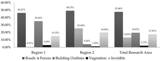 Calculated according to Equation (1), the proportion Pir was displayed in Figure 5. In the two study regions, cadastral boundary segments coincide with similar types of physical objects—but in different amounts.