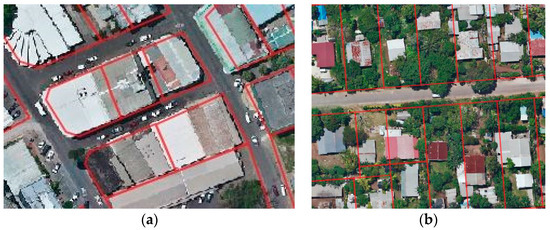 Besides specific object characteristics, by overlaying the cadastral map over the orthophoto, land parcels arrangements were observed. In Region 1, many parcel boundaries aligned closely with constructions located inside parcels. In dense urban regions, the shape and size of parcels were diverse (Figure 6a), while in rural areas, parcels were in uniform size and shape, orderly arranged. Accordingly, parcel boundaries appear like regular grids (Figure 6b). These characteristics can serve as a basis for automatically extracting them for the cadastral boundary depiction.