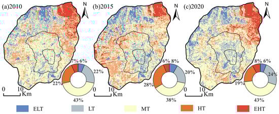 LST classification map, (a) shows the LST classification in 2010, (b) shows the LST classification in 2015, and (c) shows the LST classification in 2020.