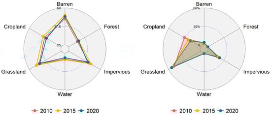 As shown in the blue–green space distribution map (Figure 4), non-blue–green spaces account for 70–80% of the study area. Green spaces represent approximately 30%, while blue spaces constitute only 0.7%. From 2010 to 2020, green space coverage declined markedly, decreasing by 11% over the decade. Blue spaces also exhibited a slight downward trend. Blue spaces are primarily located in the outer urban districts and are composed mainly of several large lakes. Green spaces are concentrated in the cropland areas of the northwestern region. The reduction in green space occurred largely along the boundary between urban land and cropland, indicating that urban expansion contributed substantially to green space loss in the study area.