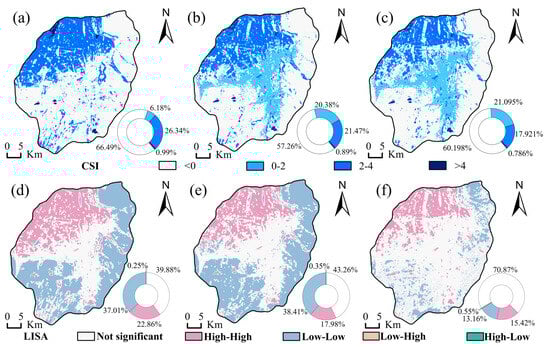 The temporal and spatial distribution map of the cooling supply capacity of blue–green spaces ((a) for 2010, (b) for 2015, (c) for 2020) and the spatial clustering map ((d) for 2010, (e) for 2015, (f) for 2020).