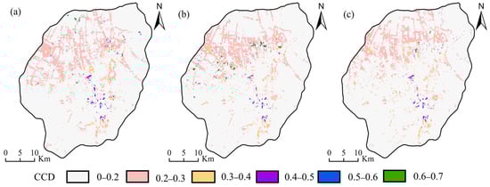The CCD values of cooling supply–demand levels in blue–green spaces ((a) for 2010, (b) for 2015, (c) for 2020).
