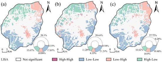 Global Moran’s I values for CSI were 0.857 in 2010, 0.833 in 2015, and 0.811 in 2020, indicating strong spatial autocorrelation throughout the study period. As shown in Figure 6, high–high and low–low clusters form the dominant spatial patterns. High–high clusters are mainly located within the northwestern cropland areas, whereas low–low clusters are concentrated in the eastern and southwestern grassland zones. Areas with insignificant clustering are primarily situated within the central impervious surfaces. High–high clusters gradually decline over time. Low–low clusters first expand and then contract sharply. Insignificant areas increase progressively. These changes can be explained by two factors. First, urban expansion enlarges the extent of insignificant areas while reducing both high–high and low–low clusters. Second, shifts in low–low clusters are influenced by changes in vegetation coverage within adjacent grassland areas.