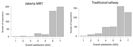 Respondents were asked to evaluate 42 questions using a seven-point Likert scale (ranging from 1, “strongly disagree,” to 7, “strongly agree”), as well as an open-ended question that allowed them to provide written responses freely. For comparison, respondents were also asked to evaluate the traditional commuter train in Jakarta (traditional railway).