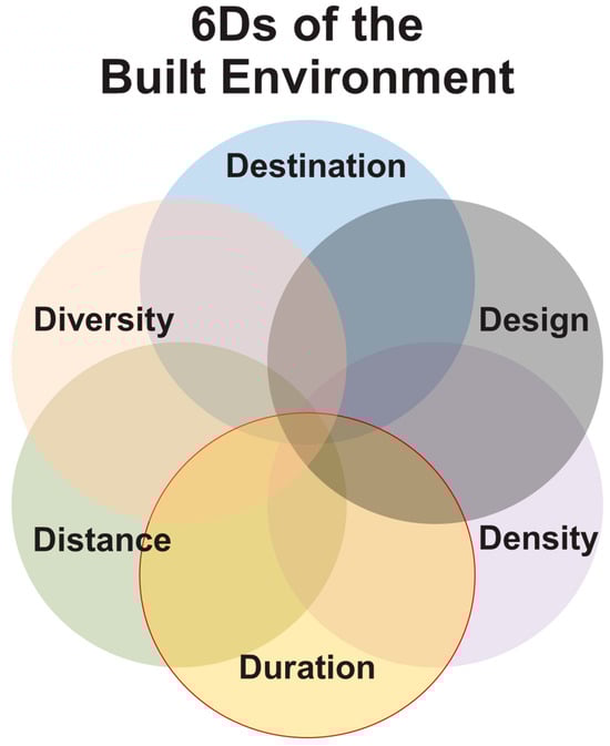 The expanded 6Ds framework, presented in Figure 4, reconceptualises the BE as a dynamic system where spatial and temporal dimensions operate jointly. Duration complements the five traditional spatial components by capturing how accessibility and mobility reliability fluctuate over time. Its inclusion shifts the analytical focus from static proximity to lived experience, revealing how congestion, scheduling, and exposure shape daily mobility outcomes. The framework thus positions time as an intrinsic property of urban accessibility, essential for evaluating equity, efficiency, and health resilience within contemporary transport systems.