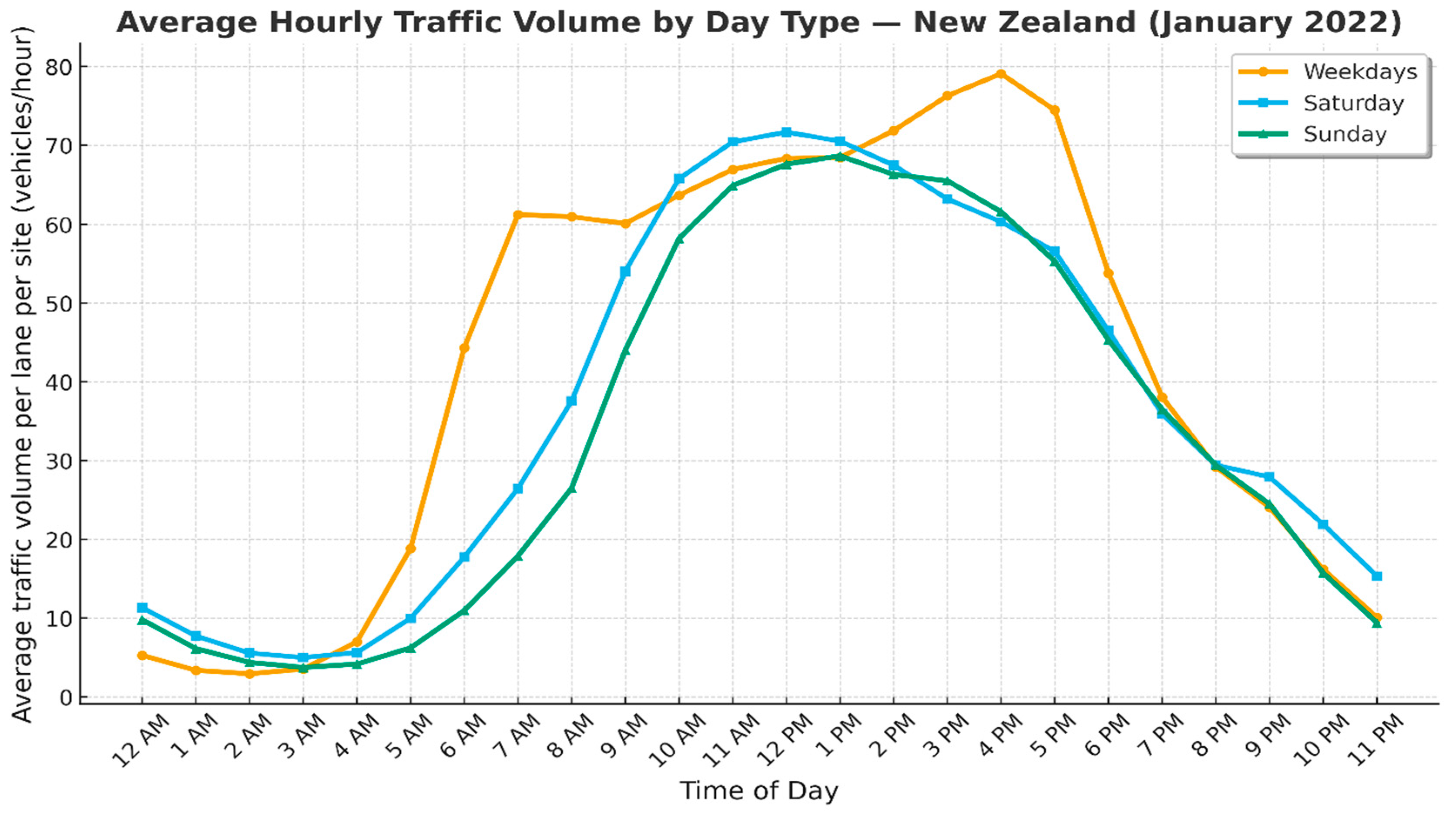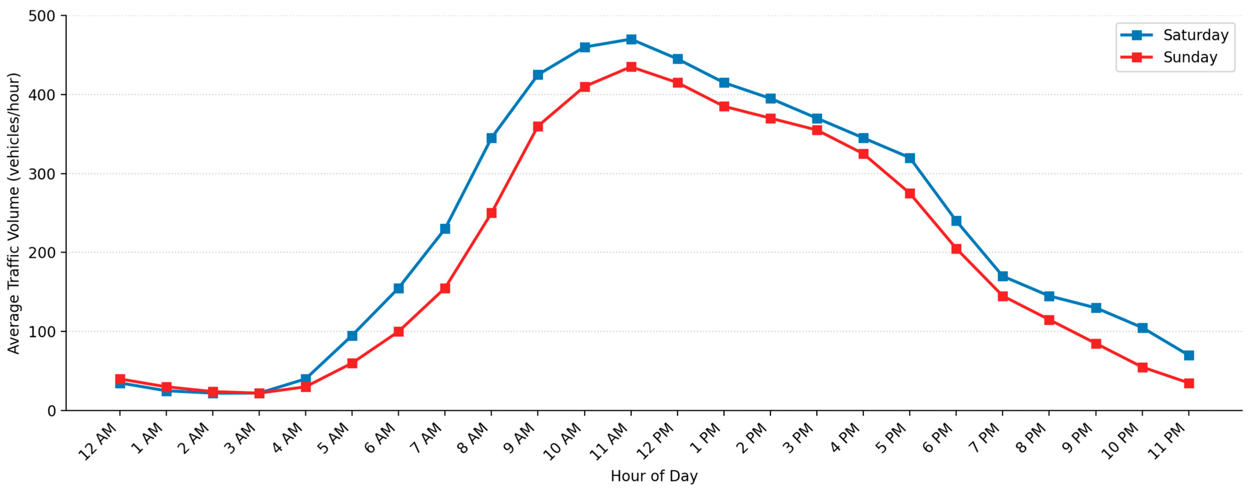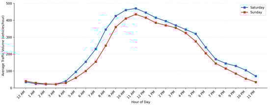 Figure 6. Temporal distribution of average weekend traffic volumes on Queensland state-controlled roads (2023). The x-axis represents hours of the day, while the y-axis represents the average traffic volume (vehicles per hour) [30]. Diagram developed by the authors.
