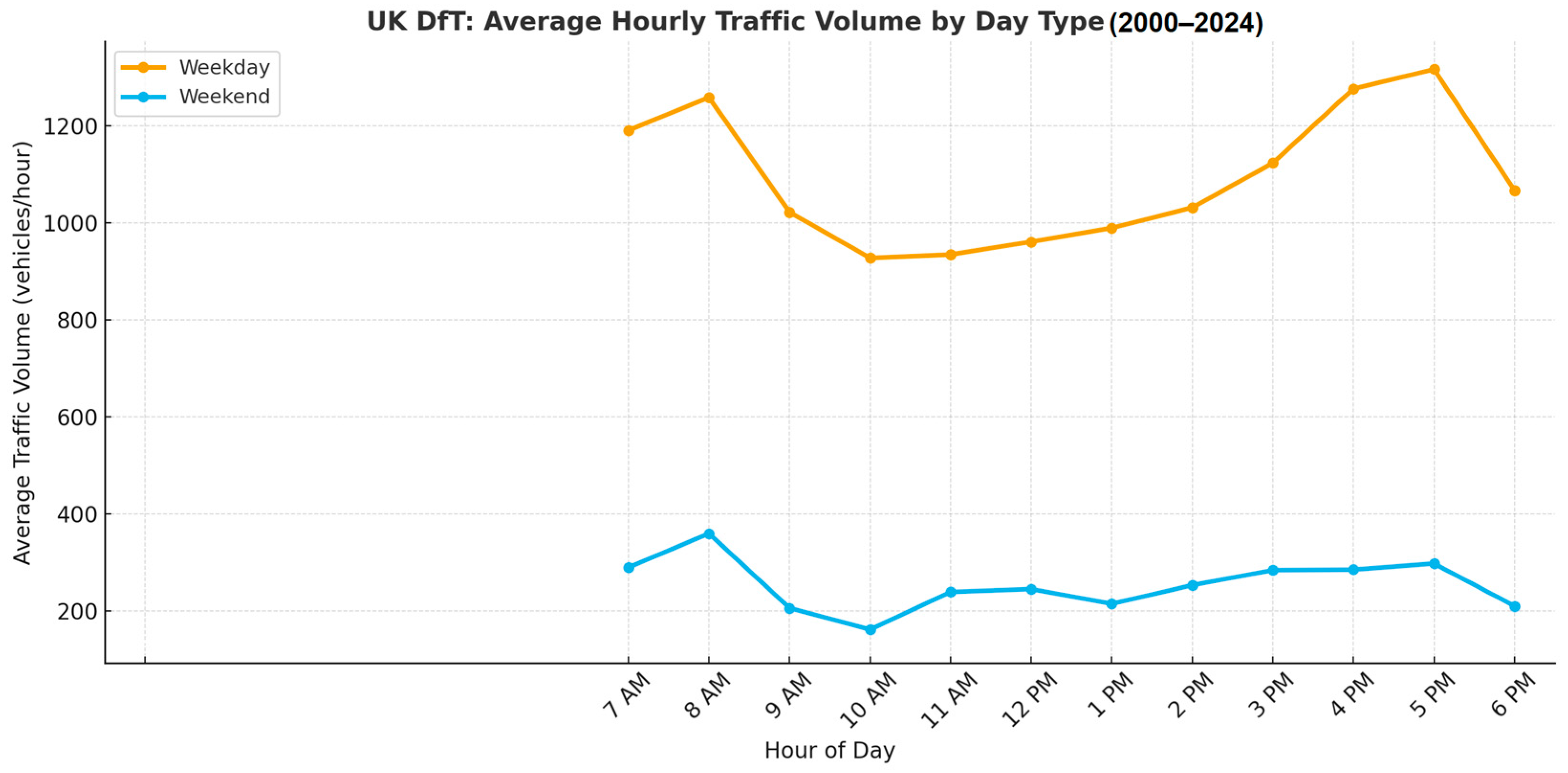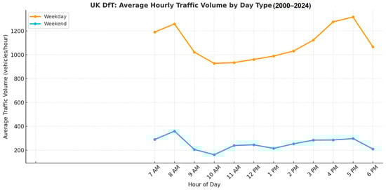 Figure 7. UK department for transport (DfT) average hourly traffic volume (vehicles/hour) by day type (2000–2024) based on DFT data [47]. Diagram developed by the authors.