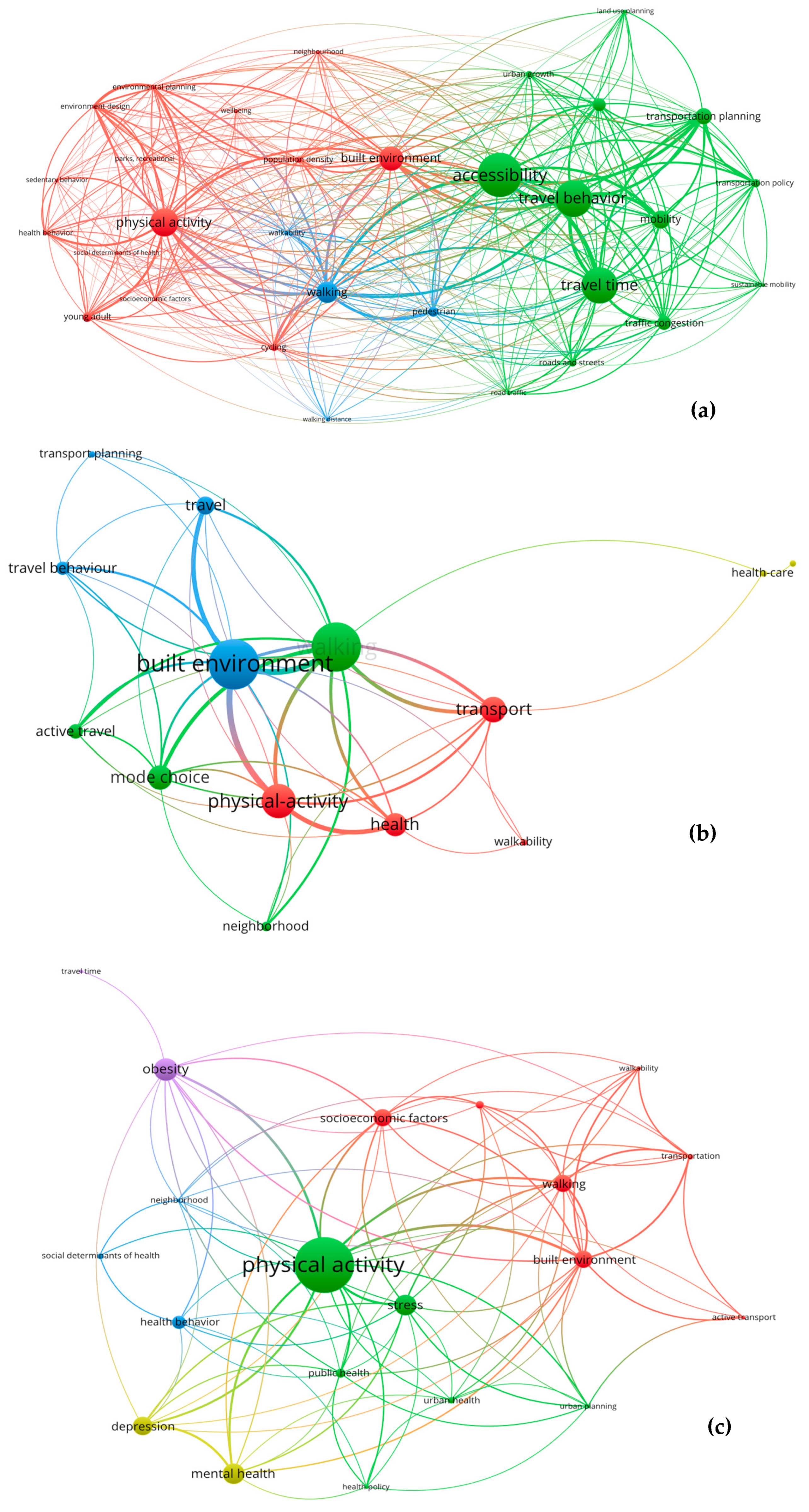 Bibliometric mapping revealed overlapping domains encompassing the BE, travel behaviour, and public health. The most frequently co-occurring keywords were related to accessibility, travel time, and BE design, alongside behavioural and psychosocial constructs such as walking and physical activity. Clusters centred on mental health, anxiety, obesity, sedentary behaviour, and cardiovascular disease indicated a strong emphasis on psychosocial and chronic disease outcomes within the mobility literature. Environmental and public health concepts, including urban health, sustainability, and social determinants, further reflected the multidisciplinary scope of this research domain. The observed clustering demonstrates that mobility research increasingly integrates spatial characteristics of urban form with behavioural and psychological dimensions, providing a foundation for examining how built environments shape movement patterns and associated health outcomes.