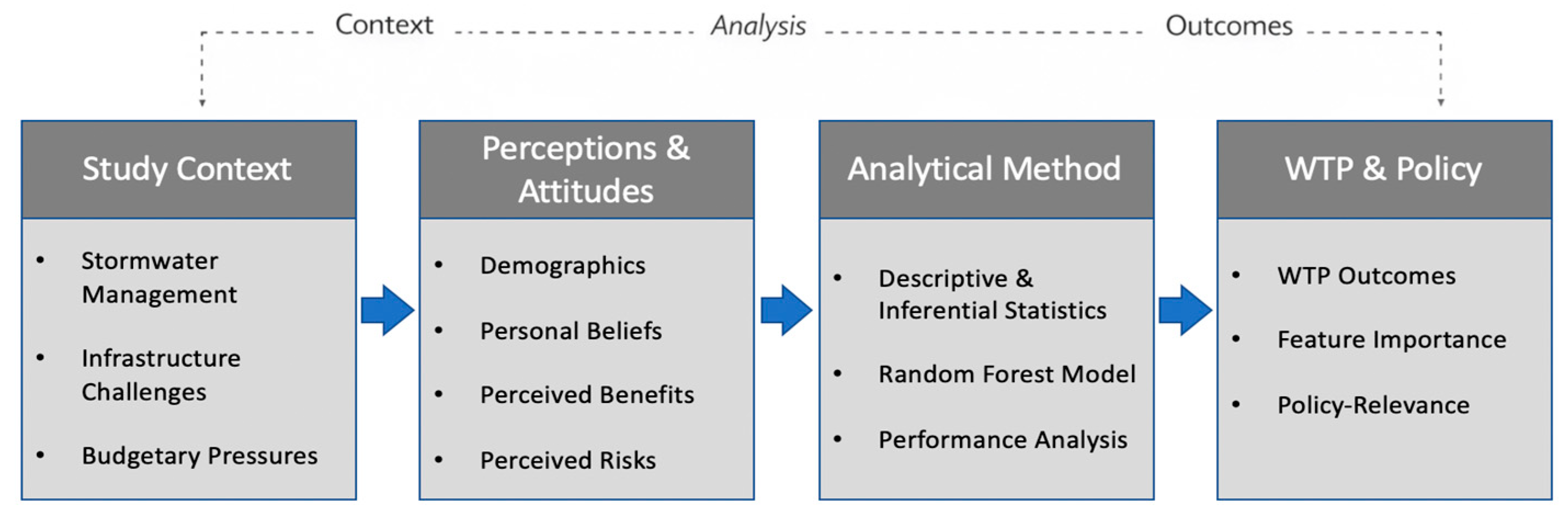 This two-stage analytical design integrates the strengths of classical statistical methods, particularly their ability to describe sample characteristics, and leverages the enhanced explanatory power of machine learning. The framework aligns with established theoretical models in environmental behavior, public goods provision, and policy acceptance, which emphasize that support for environmental initiatives is shaped by a multidimensional interplay of beliefs, perceived outcomes, perceived risks, and behavioral intentions. Such integration of descriptive, inferential, and computational approaches provides a comprehensive basis for examining the drivers of public WTP and for developing more targeted, socially responsive stormwater management policies.