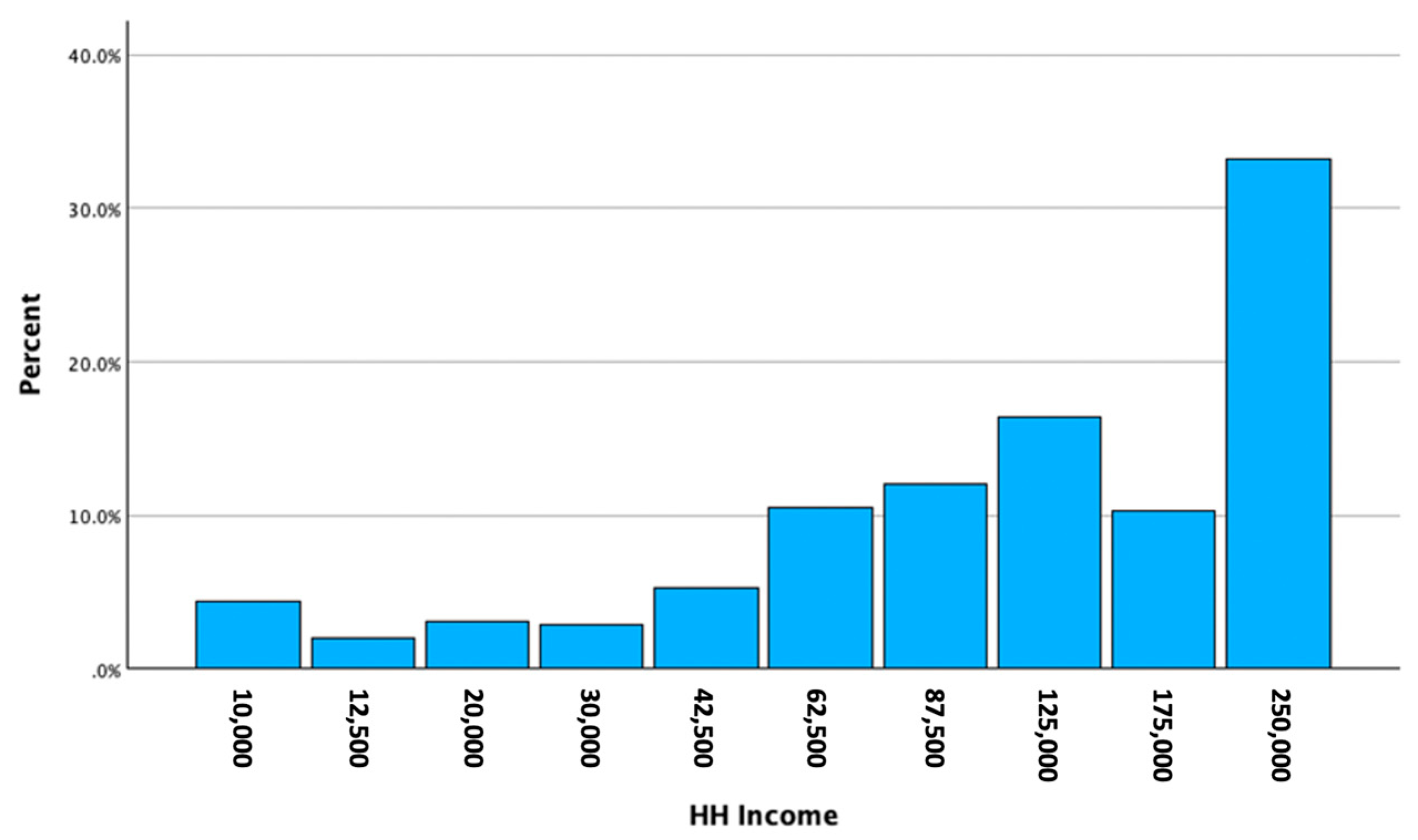 The analysis proceeded in two distinct but complementary stages. In the first stage, descriptive and inferential statistics were calculated to summarize the survey respondents’ key demographic and socio-economic characteristics. These measures provided an initial profile of the sample’s composition and allowed for comparison with the broader population of the City of Norwalk. Variables, including age, gender, income, education, housing tenure, and race/ethnicity, were compared against population benchmarks. Measures of central tendency (mean, median) and distribution (frequency, percentage) were calculated to profile the sample. Inferential statistical tests, specifically chi-square goodness-of-fit analyses, were conducted to evaluate whether observed differences between the survey sample and population benchmarks were statistically significant within the contexts of demographic groups and their relative WTP.