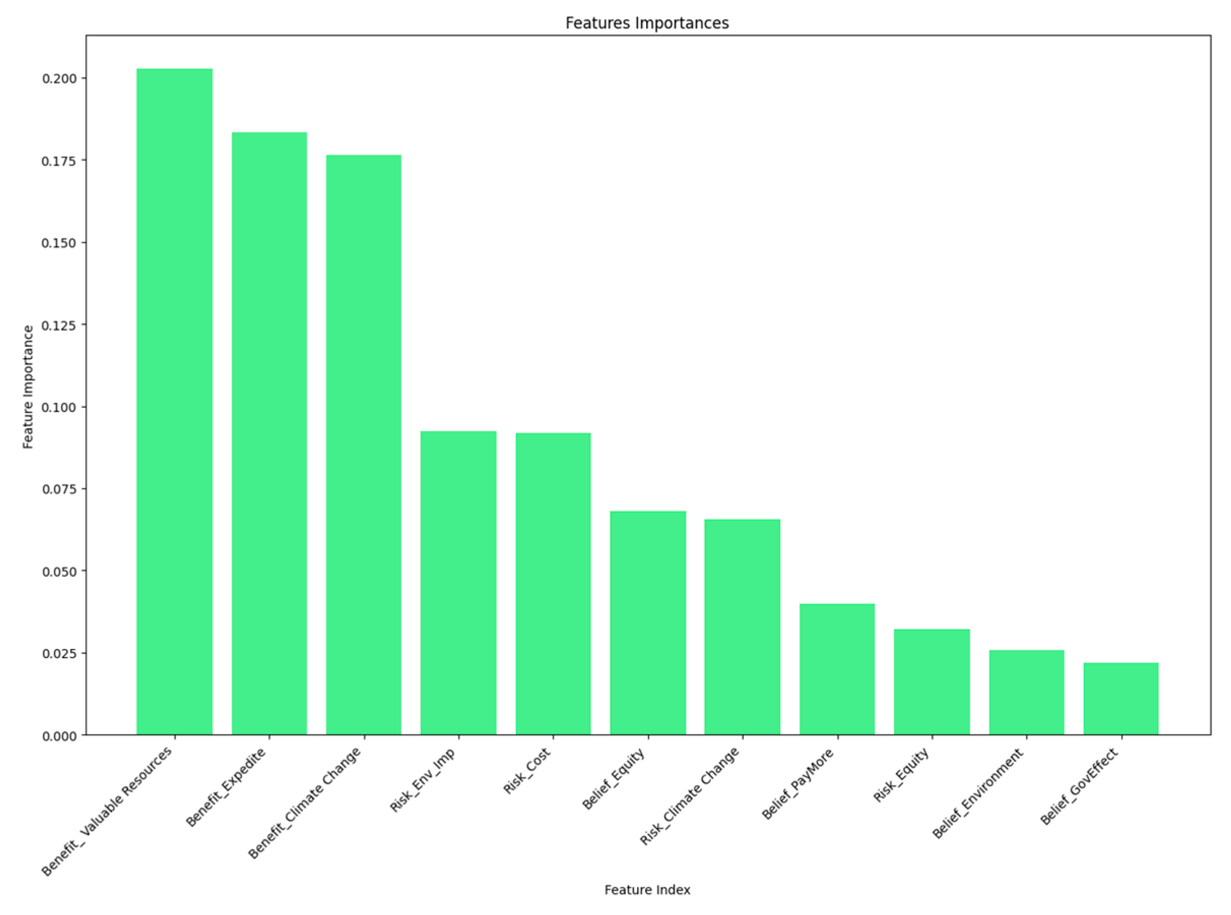 It is important to emphasize that feature importance should not be interpreted as evidence of causality. Rather, it identifies the variables most strongly associated with WTP and provides direction to weight decision factors within their context rather than assessing them as independent variables. By triangulating these findings with descriptive statistics and inferential tests, the analysis provides a more comprehensive and nuanced understanding of the behavioral dynamics underlying support for the stormwater management fee.