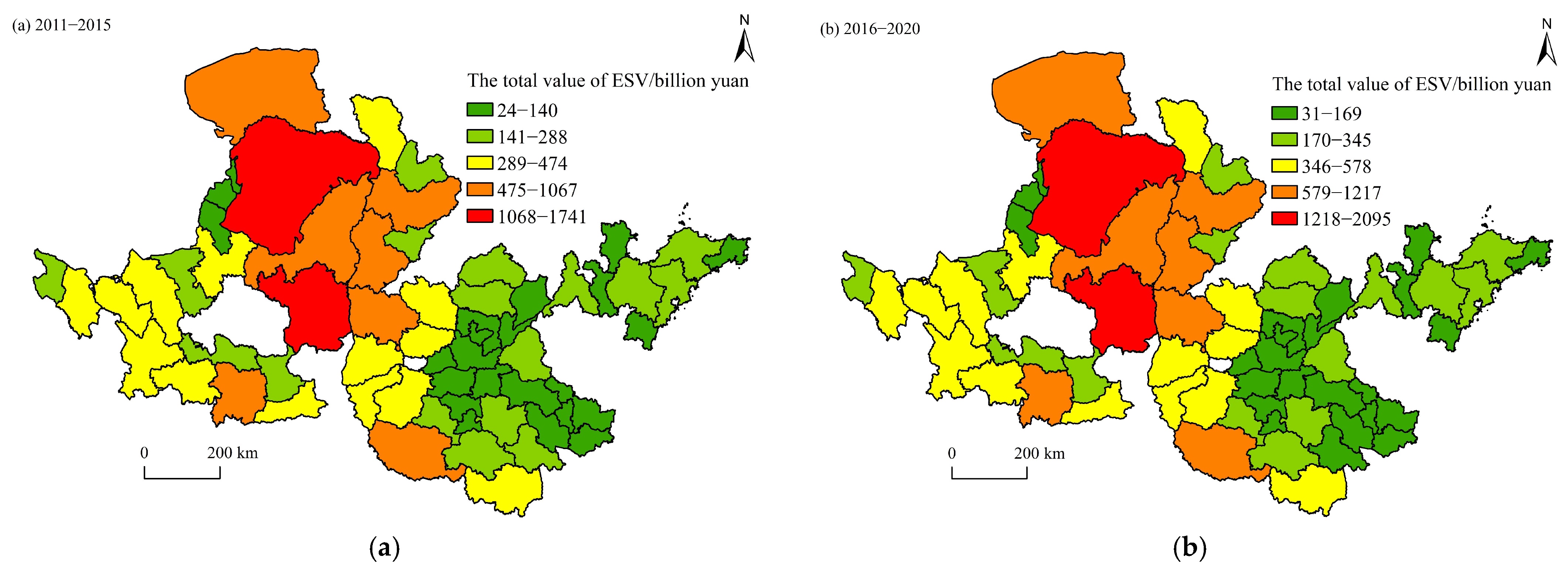 4.1. Spatial Pattern Analysis of Ecosystem Service Value